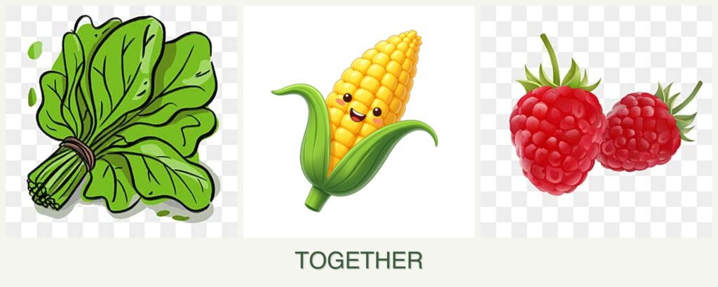 - Resource Competition: Corn’s nutrient demands can deplete soil resources needed by spinach and raspberries.