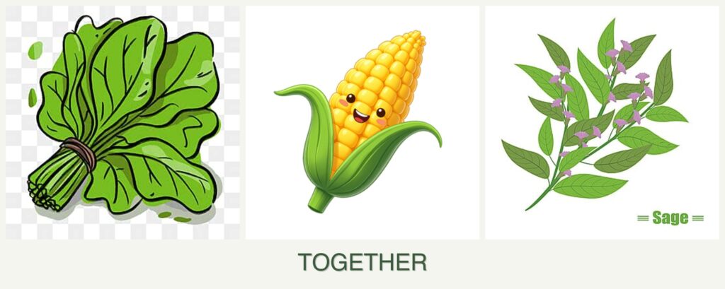 These plants can complement each other in a garden setting if their growth requirements are carefully managed. Corn’s height offers protection to spinach, while sage can deter pests with its aromatic leaves.