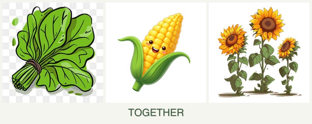 - Corn and sunflowers have deep roots that help aerate the soil, benefiting spinach’s shallow root system.
