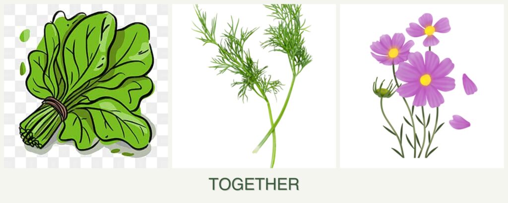 - Nutrient Needs: All three plants can grow in similar soil types, though they have varying nutrient needs. Dill and cosmos are relatively low-maintenance, while spinach may require more nitrogen.