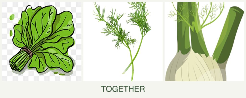 Nutrient Needs: Spinach and dill can share soil nutrients without significant issues, but fennel’s aggressive growth can deplete nutrients quickly.
