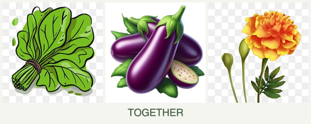 - Timing: Plant spinach early in the season, followed by eggplants as temperatures rise. Marigolds can be planted alongside either.