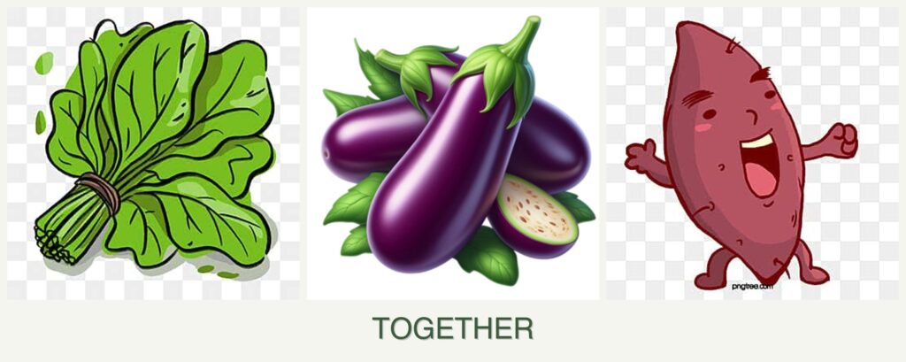 Space Efficiency: Spinach grows low to the ground, allowing eggplants to rise above while sweet potatoes spread beneath.