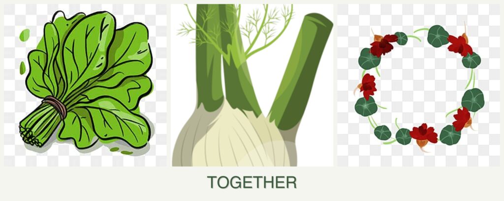 - Improved Growth: Spinach’s low-growing nature allows sunlight to reach the taller fennel and spreading nasturtiums.