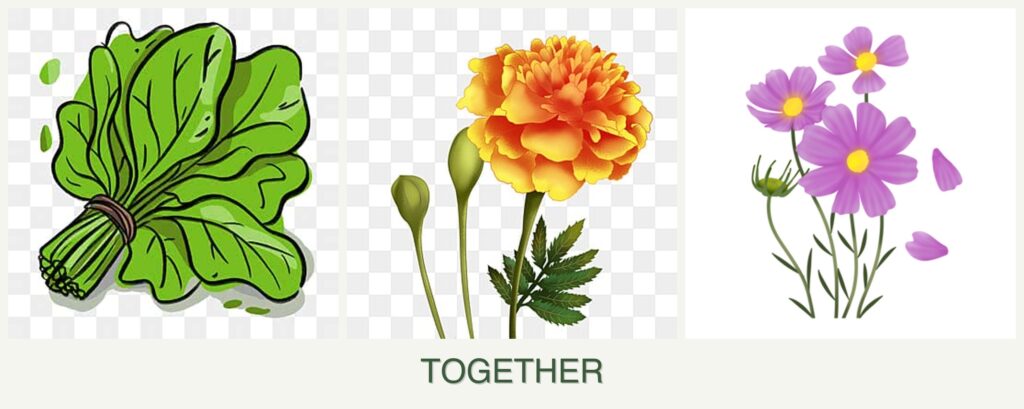 - Timing: Plant spinach in early spring or fall, and marigolds and cosmos after the last frost.