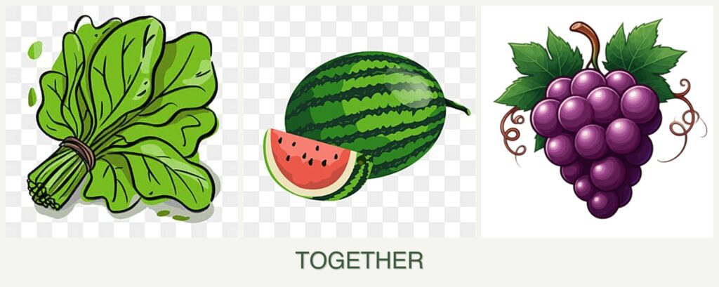 - Growth Requirements: Spinach prefers cooler temperatures and partial shade, while melons and grapes need full sun and warm conditions.