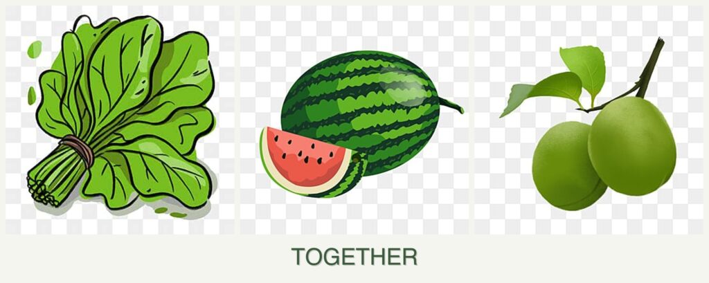Competition for Resources: Different water and nutrient needs can lead to competition, particularly between melons and spinach.