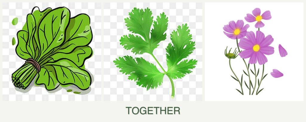 - Nutrient Needs: Spinach and parsley have similar nutrient requirements, while cosmos is less demanding, reducing competition for soil nutrients.