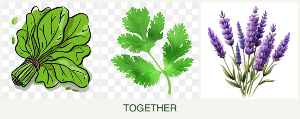 Resource Competition: Lavender’s need for well-drained soil contrasts with spinach and parsley’s preference for moisture, requiring careful watering management.