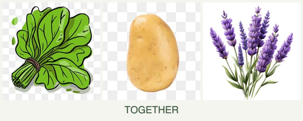 Competition for Resources: Potatoes and spinach may compete for nutrients, while lavender’s low nutrient needs make it less competitive.