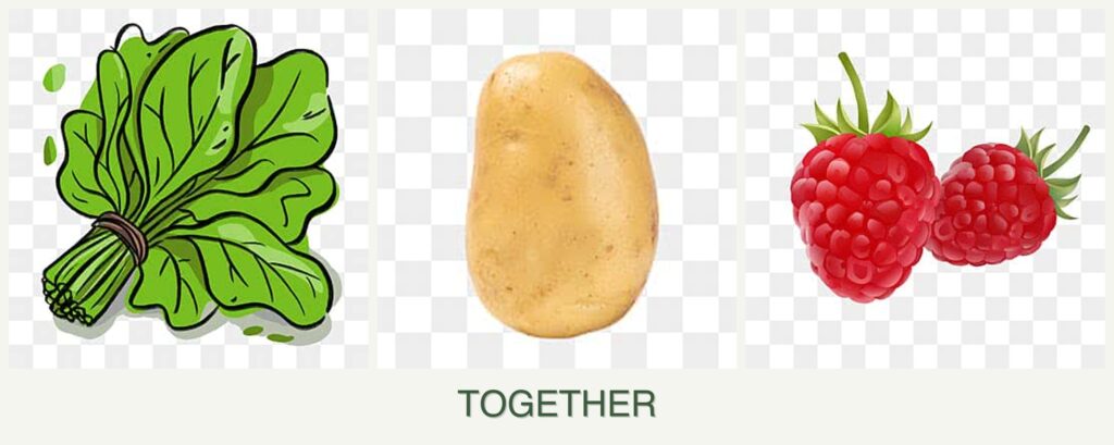 It’s best not to plant them together due to their differing needs. Plant spinach in early spring or fall, potatoes after the last frost, and raspberries in early spring.