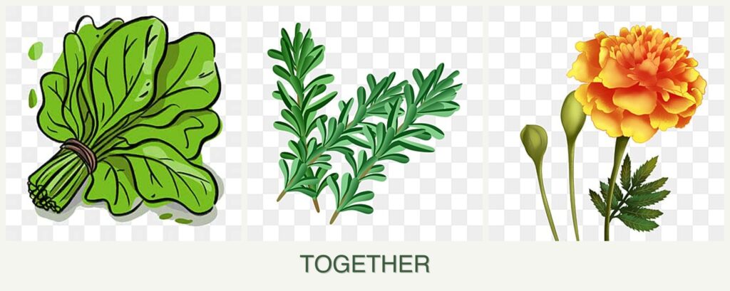 Planting spinach, rosemary, and marigolds together offers several advantages: