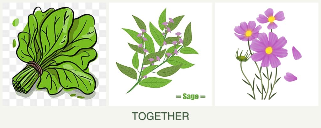 - Growth Requirements: Sage and cosmos prefer full sun, while spinach can tolerate some shade. Planting cosmos can provide some partial shade for spinach.