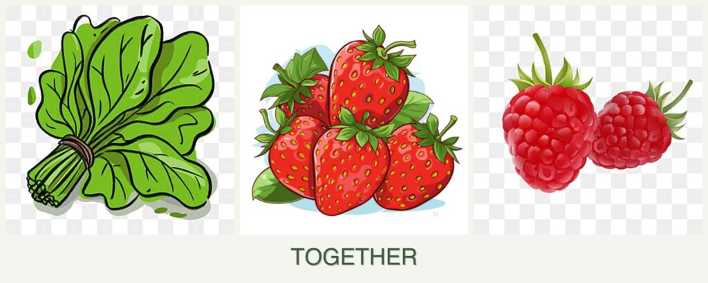 Pest Repellent Properties: Strawberries can deter nematodes that affect spinach, while spinach’s dense foliage can suppress weeds around raspberries.