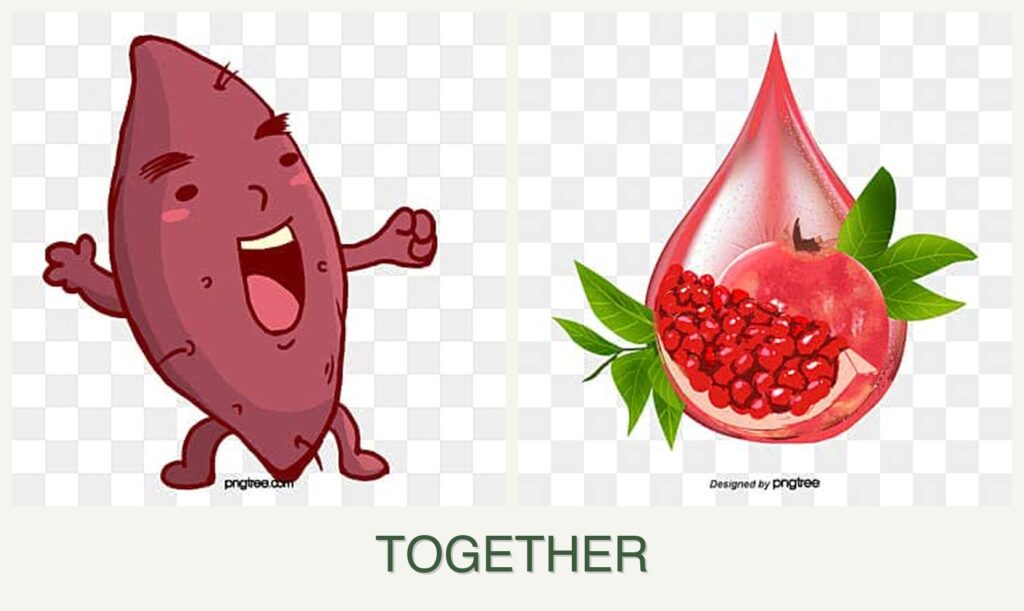 It’s best not to plant them together; however, plant sweet potatoes in late spring and pomegranates in early spring or fall.