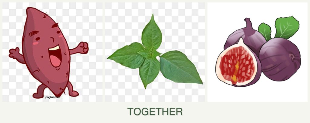 Spacing: Figs grow large and require space, so planting basil and sweet potatoes at a distance ensures they receive adequate sunlight and nutrients.
