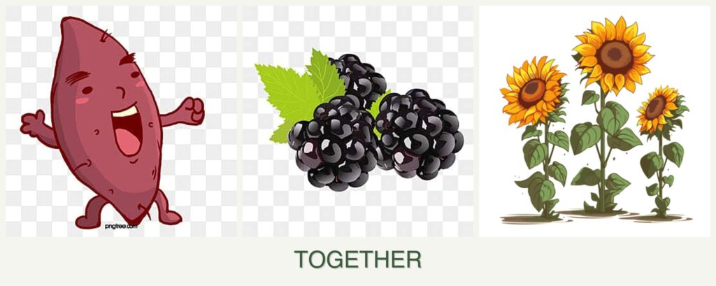 - Growth Requirements: Sweet potatoes, blackberries, and sunflowers all prefer full sun, making them compatible in terms of sunlight needs.