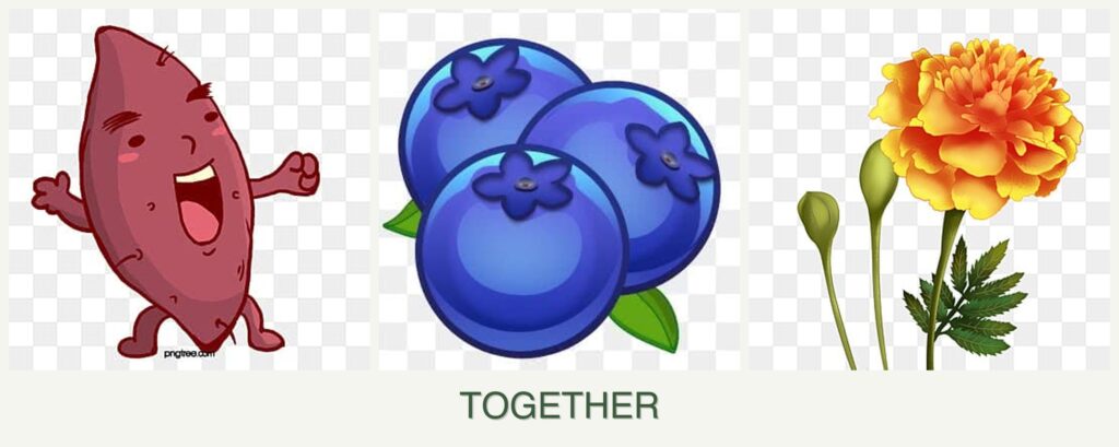 - When is the best time to plant these plants together? Plant sweet potatoes and marigolds after the last frost, while blueberries are best planted in early spring or fall.