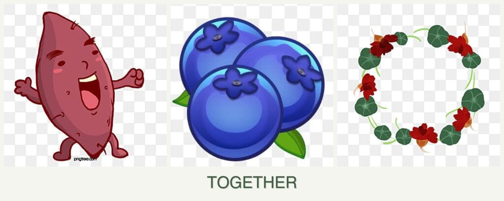 - Growth Requirements: Sweet potatoes and nasturtiums thrive in similar conditions, while blueberries need acidic soil.