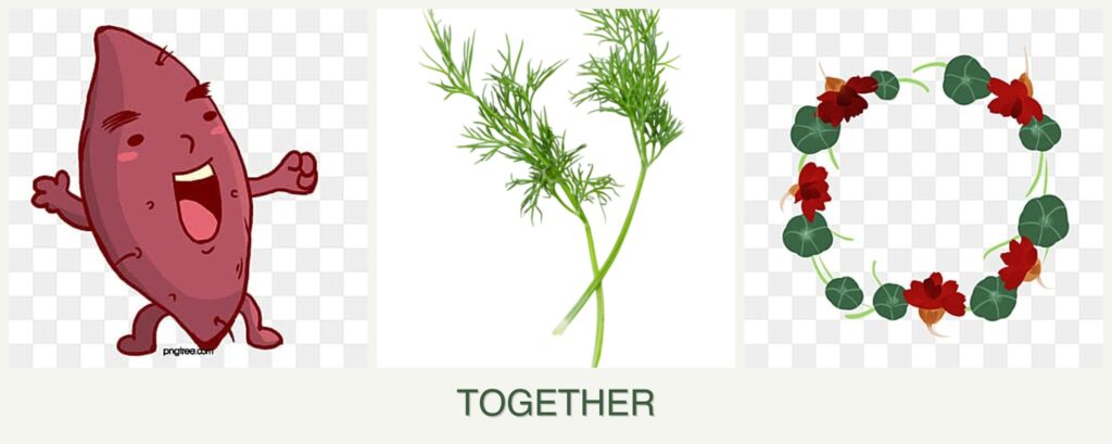 - Pest Control: Nasturtiums are known for their pest-repellent properties, which can help protect sweet potatoes from aphids and other insects. Dill attracts beneficial insects like ladybugs, which can further aid in pest control.