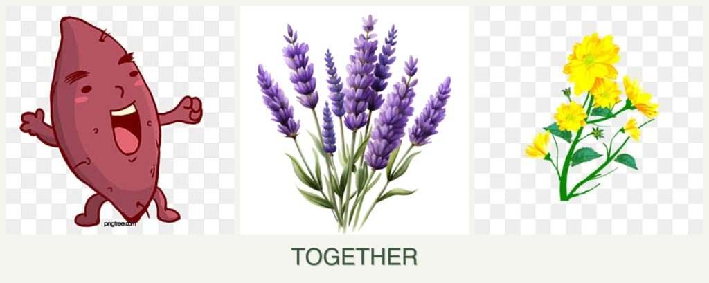 - Space Efficiency: Sweet potatoes’ vines cover the ground, reducing weed growth, while lavender and calendula can fill vertical space.