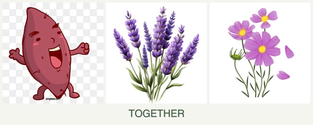 - Space Efficiency: Sweet potatoes’ sprawling habit can cover the ground, reducing weeds, while cosmos and lavender add vertical interest.