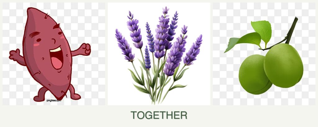 - Spacing: Sweet potatoes need room to spread, which could interfere with the growth of lavender and plum trees.