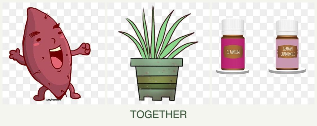 - Growth Requirements: Sweet potatoes prefer warm, sunny conditions, which align well with the needs of lemongrass and geraniums.