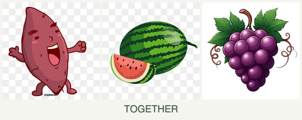 - Growth Requirements: All three plants need full sun, but grapes require vertical space, while sweet potatoes and melons spread horizontally.