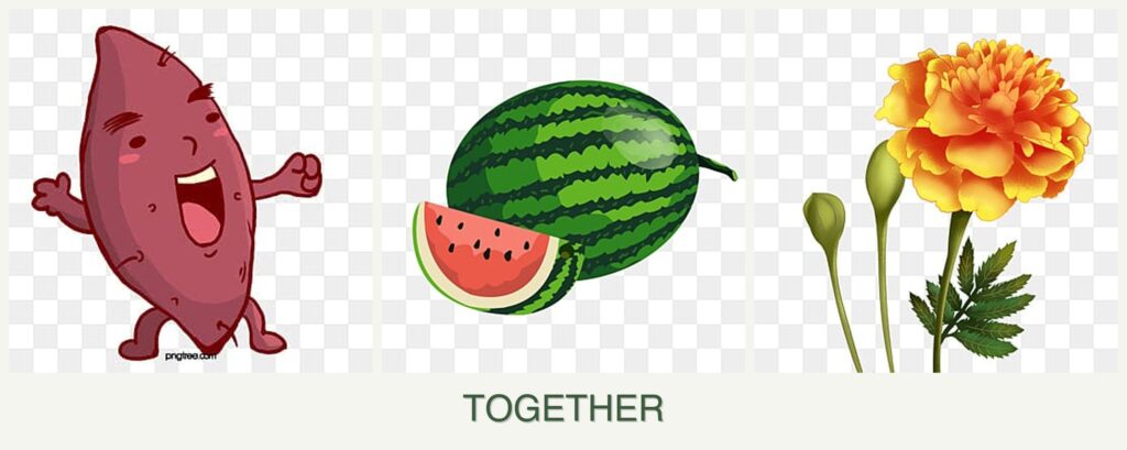 - Growth Requirements: Sweet potatoes and melons thrive in warm climates with full sun, while marigolds can adapt to various conditions.