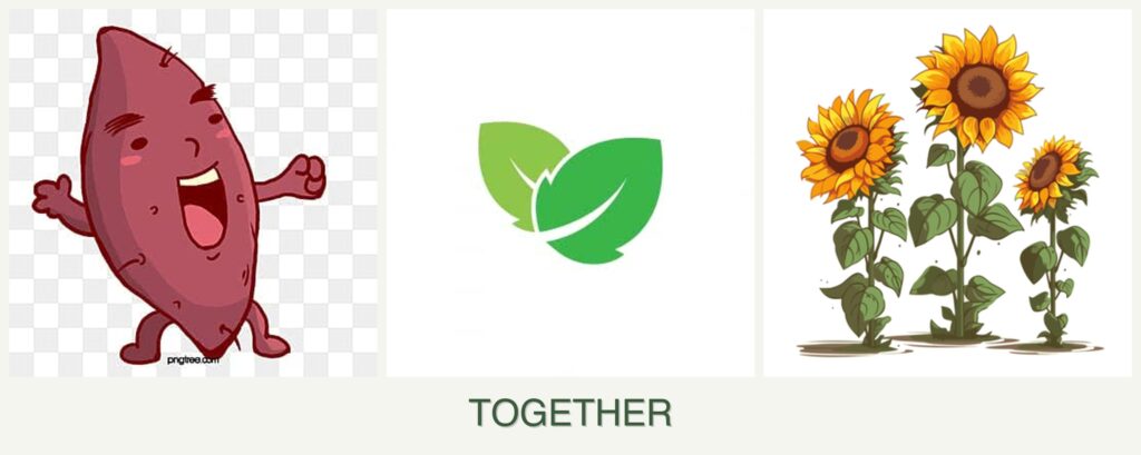 - Spacing: Sweet potatoes spread along the ground, sunflowers grow tall, and mint can fill in gaps, allowing for efficient use of vertical and horizontal space.