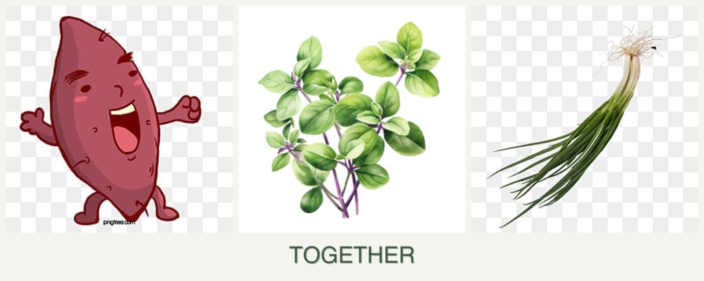 Planting sweet potatoes, oregano, and chives together offers several advantages: