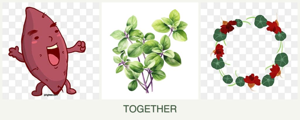 Planting sweet potatoes, oregano, and nasturtiums together offers several benefits: