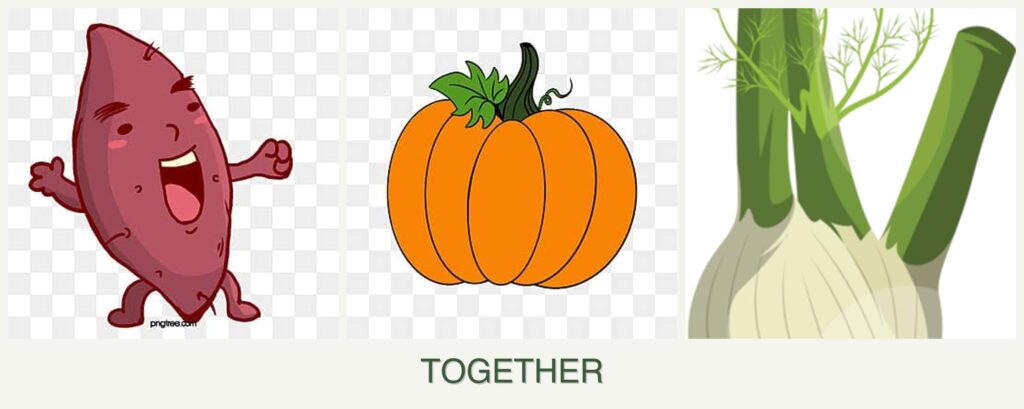 Nutrient Needs and Spacing: Sweet potatoes and pumpkins have sprawling growth habits that require ample space and nutrients, potentially leading to competition if planted too closely. Fennel’s deep root system can further complicate nutrient competition.