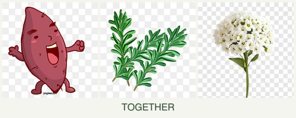What should not be planted with sweet potatoes, rosemary, and alyssum?
