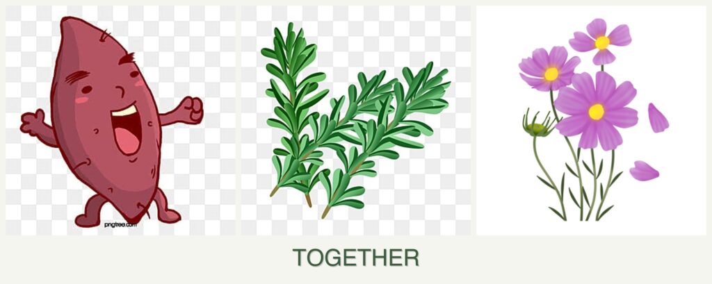 Can sweet potatoes, rosemary, and cosmos be planted together?