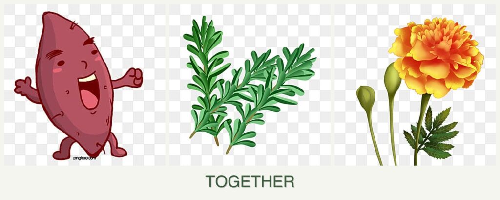 - Pest Repellent Properties: Marigolds are renowned for their ability to repel nematodes and other pests, protecting sweet potatoes. Rosemary’s scent can also deter insects.