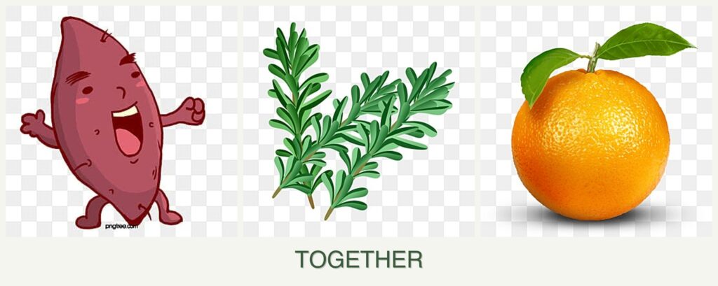 - Companion Plants: Pair sweet potatoes with beans or marigolds, rosemary with sage or thyme, and oranges with basil or lavender.