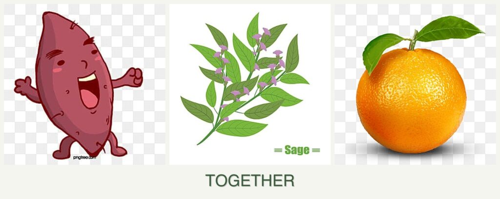 Pest Control: Sage can help repel pests, but sweet potatoes and oranges do not share common pests that sage would deter.