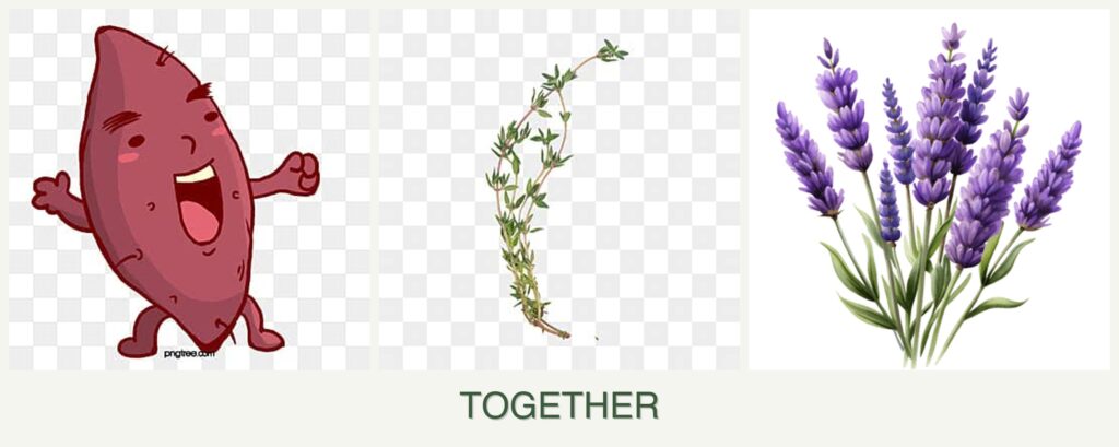 Planting sweet potatoes, thyme, and lavender together offers several benefits: