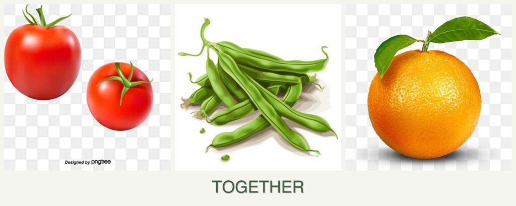 Growth Requirements: Tomatoes and beans thrive in similar conditions, needing full sun and well-drained soil. Oranges, however, are trees with different space and light requirements, making them less suitable companions.