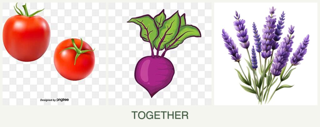 - Growth Requirements: Tomatoes and beets both thrive in full sun and well-drained soil, while lavender prefers slightly drier conditions.