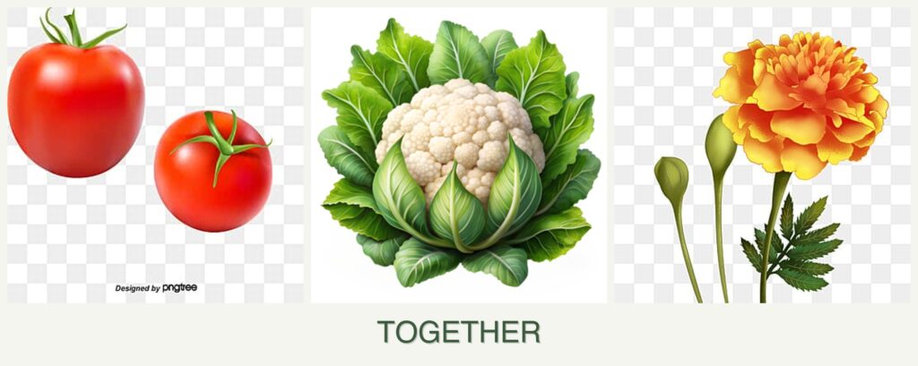 Planting tomatoes, cauliflower, and marigolds together offers several benefits: