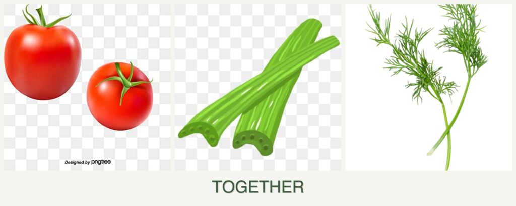 - Nutrient Needs: Celery and tomatoes are heavy feeders. Dill, being less demanding, doesn’t compete significantly for nutrients.