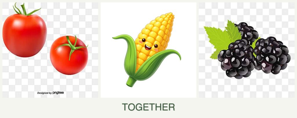 - Growth Requirements: Tomatoes and corn both require full sun and well-drained soil, but blackberries have a different nutrient requirement and can spread aggressively.