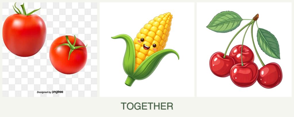 Growth Requirements: Tomatoes and corn both thrive in full sun and require similar soil conditions, making them relatively compatible. However, cherries, being perennial trees, have different needs and can overshadow or compete with annuals like tomatoes and corn.