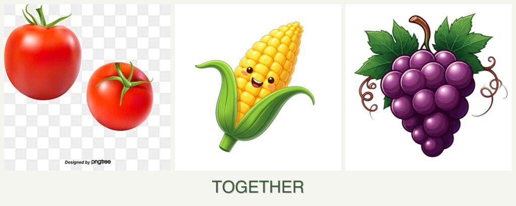 - Timing: Plant tomatoes and corn after the last frost; grapes should be planted in early spring.