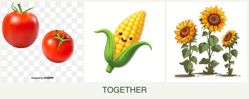 Growth Habit: Corn grows tall and straight, making it an excellent windbreak for tomatoes. Sunflowers can grow even taller, providing additional support and shade.