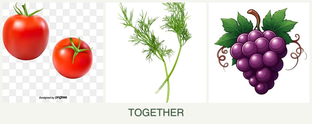 - Growth Requirements: Tomatoes and dill thrive in similar conditions, while grapes require more space and support.