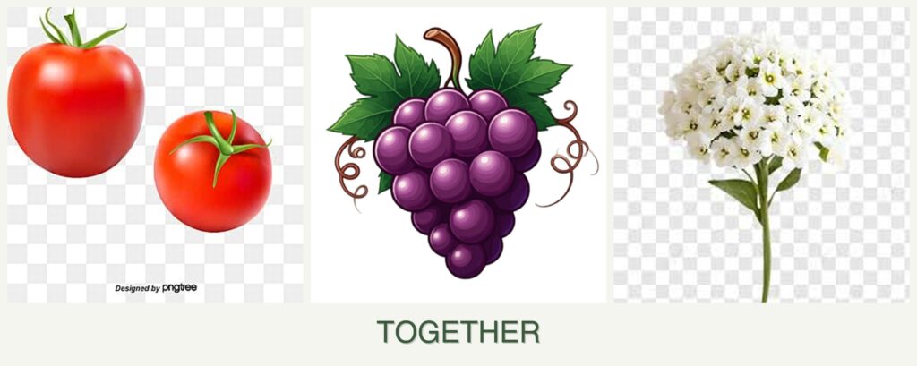 - Growth Requirements: Tomatoes and grapes both need full sun and well-drained soil, while alyssum can tolerate partial shade and acts as a beneficial ground cover.
